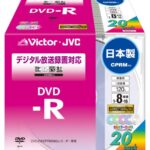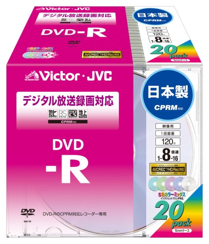 VictorのDVD-RはCPRM対応で、16倍速で書き込み可能。120分録画でき、容量は4.7GB。カラープリンタブル仕様で、20枚入りの日本製です。