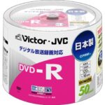 VictorのDVD-RはCPRM対応で、16倍速、120分の録画が可能です。4.7GBの容量を持ち、ワイドホワイトプリンタブル仕様で、50枚セットの日本製です。