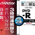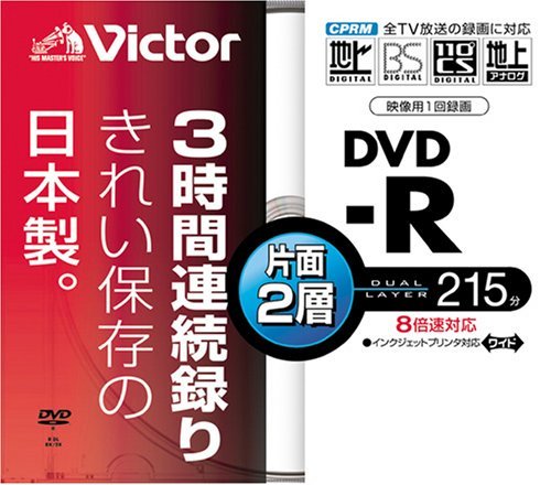 VictorのDVD-Rは片面2層でCPRM対応、8倍速録画に対応。215分の記録が可能で、容量は8.5GB。ホワイトプリンタブル仕様で、日本製の高品質なディスクです。