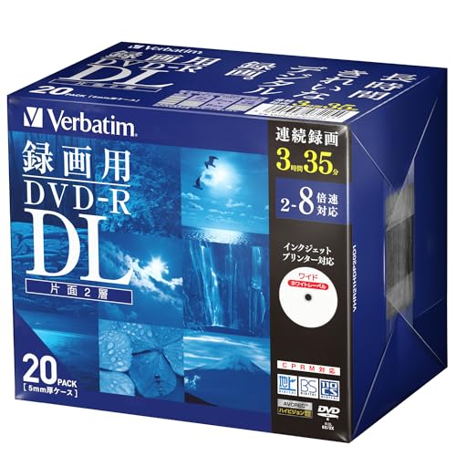 バーベイタムジャパン 1回録画用 DVD-R DL CPRM対応、215分録画可能、20枚入りホワイトプリンタブル。片面2層設計、2-8倍速に対応。高品質で信頼性のあるDVDメディアです。