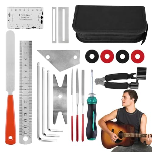 ギターピックやヘックスレンチ、ファイルが付属したキャリーバッグ付きのギター修理ツールキット。アコースティックギターのメンテナンスを簡単に行える便利なアイテムです。