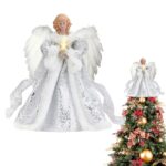 エレガントな木の天使飾りは、ポーズ可能な布人形で、ユニークなコレクターアイテムです。白とゴールドのデザインは、ホリデーデコレーションに最適。