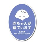 赤ちゃんが寝ています。急用以外の訪問をお断りするための青いシールステッカー。玄関インターホンやチャイムに貼れる防水対応の製品です。