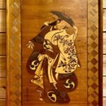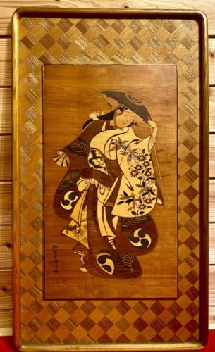 寄木工芸の木象嵌作品、神場幸雄作の美人画。共箱付きで、精緻な木彫が施された日本の伝統工芸品。職人の技が光る木工細工で、民芸品や日本土産として最適です。
