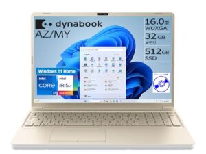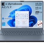 dynabook AZ/LY Webモデルは、16型大画面、DVDドライブ搭載のオールインワンノートPC。Windows 11 Home、第13世代Core i5、SSD使用。カラーはアッシュブルーです。