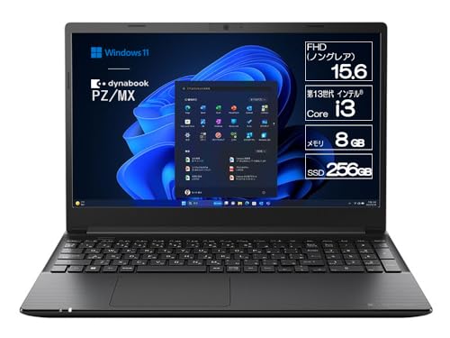 dynabook PZ/MXは、Windows 11 Pro搭載の15.6型スタンダードノートPCです。第13世代Core i3、SSDを搭載し、シンプルかつパフォーマンスに優れたブラックモデルです。