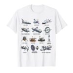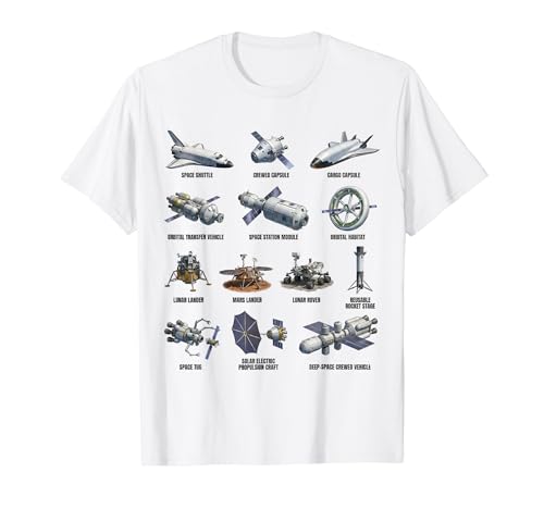 宇宙船の種類をデザインしたTシャツ。宇宙探査や天文学の魅力を表現し、科学の楽しさを伝えます。スタイリッシュでユニークなアイテムとして、宇宙好きにはたまらない一品!