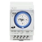 機械式タイマーは15分から24時間の間隔で設定可能。イマースイッチタイプで250VAC、16Aの電流に対応し、時間リレー機能も備えています。