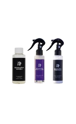 サムライプロデュースの足回りお手入れセットは、高級タイヤ艶出し剤TIRE-WAX、鉄粉除去クリーナーIRON-LUSH、濃密泡立ちカーシャンプーで構成。タイヤ、ホイールを美しく保ち、車の外観を引き立てます。