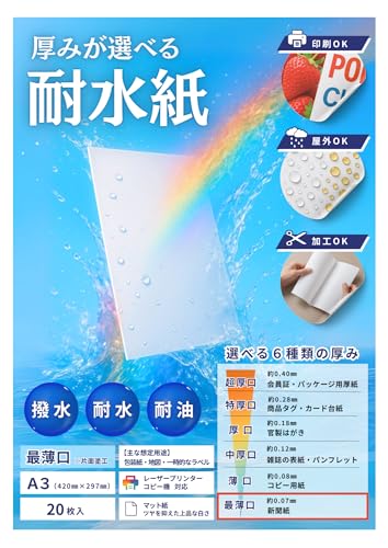 厚みが選べる耐水紙、国内製造。耐水性・撥水性・耐油性あり。約0.07〜0.4mm厚、レーザープリンタ対応。色鮮やかな印刷が可能で、チラシやPOP、ラベル、商品タグに最適。A4最薄口1000枚、A3、B4、B5サイズもあり。