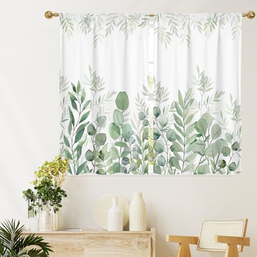 MitoVillaのユーカリの葉を描いたキッチンカーテン。長さ39インチの水彩画スタイルで、小さな窓やクローゼットのドアに最適な2枚組パネル。ロッドポケット付きで取り付け簡単!