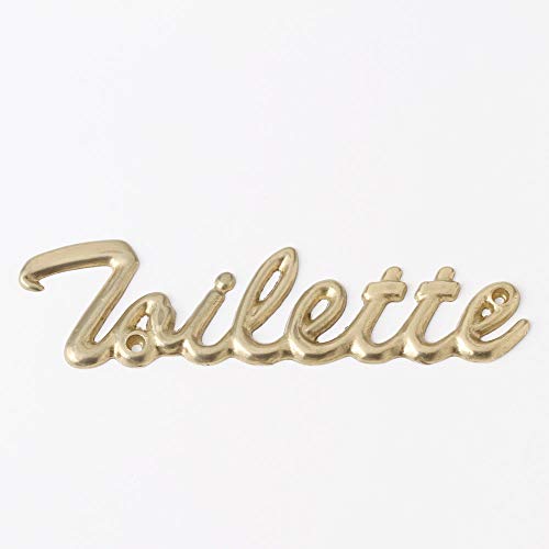 イタリア製の真鍮製トイレサインプレートです。筆記体で「TOILETTE」と記され、金色(ゴールド)が特徴。インテリアにも馴染む上品なデザインで、ドアに取り付けて使用します。