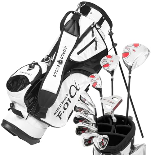 ワールドイーグル F-01α メンズ ゴルフ クラブ フルセットは、ホワイトのバッグ付きで、右打ち用・フレックスS仕様です。初心者から中級者向けに設計され、使いやすいクラブが揃っています。