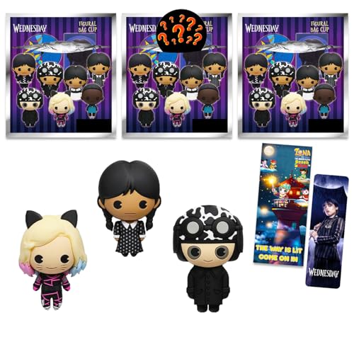 水曜日のアダムズをテーマにしたブラインドバッグ。キーホルダーミステリーフィギュア3個とブックマーク付き。大人も子供も楽しめるパーティー記念品に最適!