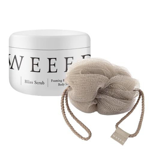WEEEDのブリススクラブは360gのボディスクラブで、ラベンダー&バニラの香りが楽しめます。薬用で日本製、ニキビ予防や保湿効果があり、オリジナルの泡立てネット(ダブル)付き。