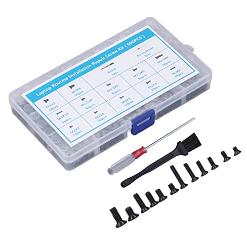 600本のノートPC用ネジセット。M2、M2.5、M3の12サイズが揃い、炭素鋼製。ドライバーとブラシ付き、収納ケース入りで便利。ラップトップの交換用に最適。