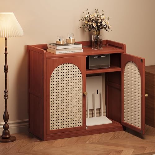 フロアスタンディングのバンブールーターストレージボックス。WiFiルーターとモデム用の多層棚付き。ケーブル管理も可能なオーガナイザー。カラーはレッド。