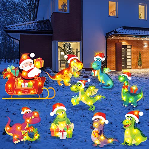 9ピースの恐竜とサンタクロースのクリスマス屋外芝生装飾。LEDストリングライト付きで、大型のデコレーション。屋外ホリデーに最適!