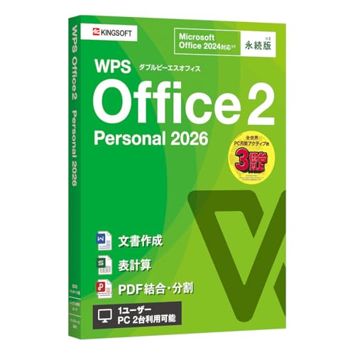 キングソフトのWPS Office 2 Personal 2026は、Microsoft Officeと高い互換性を持つ永続版オフィスソフトです。Word、Excel、PDFに対応しており、Windowsで利用可能です。