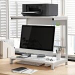 ホワイトのモニタースタンドは、60x30x55cmサイズで机上を整理し、キーボード収納が可能。猫背予防に最適で、組み立てが簡単な省スペース設計です。