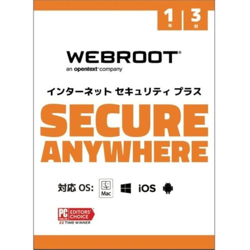 Webroot SecureAnywhere インターネットセキュリティプラス 1年3台版は、リアルタイムのウイルス防止、ファイアウォール、個人情報保護機能を提供し、複数デバイスを保護します。軽快な動作が特徴。
