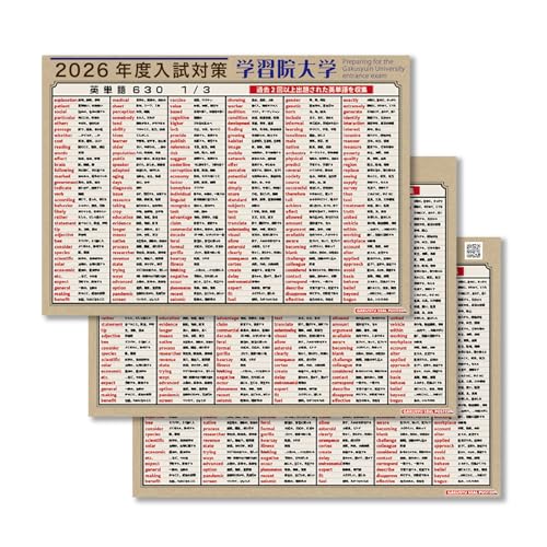 2026年度学習院大学対応の英単語ポスター3枚セットです。630個の単語が頻出順に掲載。防水素材でお風呂に貼れ、はがせるので賃貸にも最適。テスト勉強を自然にサポート!単語全リスト特典付き。