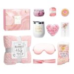 女性向けのセルフケアセット。フランネルブランケット付きで、リラクゼーションを提供します。誕生日ギフトにも最適なバスケットです。