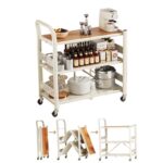 JOOHYキッチンワゴンは、折りたたみ可能な3段式収納カートです。幅70cm、奥行き36cm、高さ105cmで、調味料や食器、ペットボトルを収納できます。移動も簡単で多機能なホワイトデザイン。