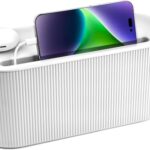 電源タップやケーブルをスッキリ収納できるコンセントボックス。おしゃれなデザインで配線を隠し、スマホ置きにも最適。寝室やリビング、オフィス、キッチンで活躍します。