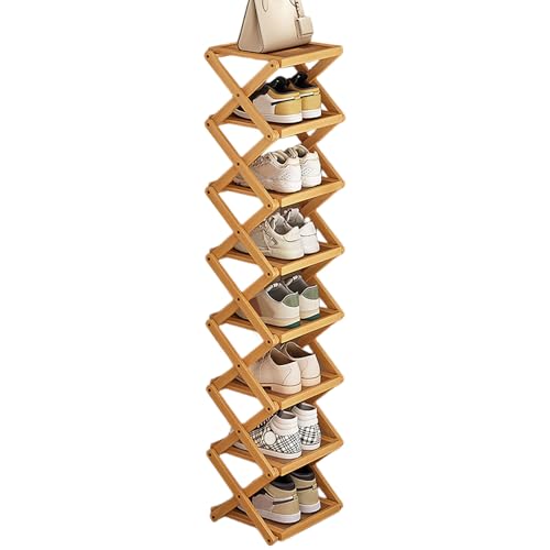 XINYINLWのスリムシューズラックは、組立不要で靴を効率的に収納できます。竹製でコンパクト、2~8段の伸縮性あり。玄関やベランダに最適な折畳式設計。