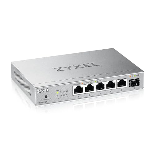 Zyxelの8/5ポート2.5Gbpsスイッチングハブ(XMG-105)。会議室ネットワーク構築向けで、Cat6対応。静音ファンレス設計、デスクトップ及び壁掛けに対応し、設定不要。インボイス対応の適格事業者。