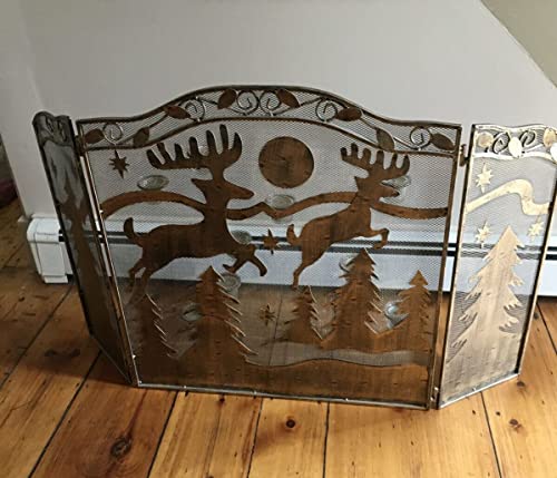 素朴な金属製の重厚な暖炉スクリーン。トナカイとクリスマスツリーのデザイン。9本のキャンドル付きで、フラット暖炉にも最適。