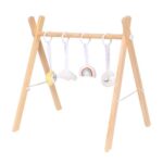 木製の北欧風ベビージム。赤ちゃんの感覚発達をサポートし、安全デザイン。星、太陽、雲、月のアクセサリー付き。出産祝いに最適なおしゃれなおもちゃ。