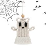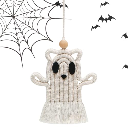ハロウィーンの織物ゴースト装飾品。かわいいデザインで車のバックミラーやドア、マントルピースに最適。マクラメタペストリーで季節の雰囲気を演出し、写真撮影の小道具としても活躍します。