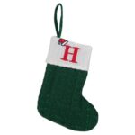 クリスマスツリーに最適なイニシャル刺繍付きストッキング。緑と白のデザインで、壁やドアの季節装飾にぴったり。キャンディバッグとしても使用可能。