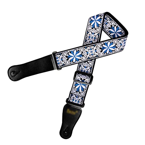 アコースティック・エレキギターに最適な調整可能な刺繍ギターストラップ。ベースブルーのデザインで、スタイリッシュにプレイ可能。耐久性があり、快適なフィット感を実現。