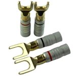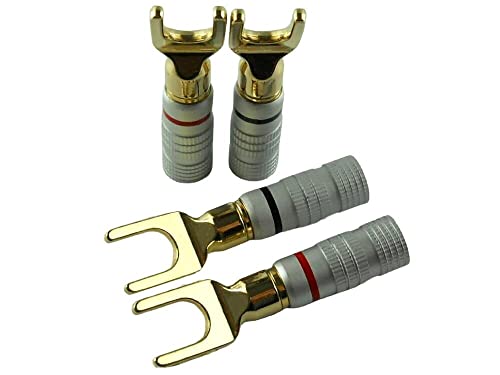 Yラグ端子、Y端子、U端子のスピーカー用接続部品で、24K金メッキ仕様。ゴールドのソルダーレス設計で、使いやすい無地デザイン。4本セットで提供。