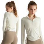 Solcyのスポーツウェアは、レディース向けの長袖Tシャツで、ハイネック・ハーフジップデザインです。指穴付き、吸汗速乾機能を持ち、フィットネスやヨガ、ピラティス、トレーニングに適しています。サイズはM、カラーはホワイトです。