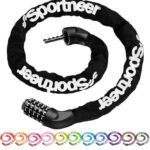 Sportneerの自転車用チェーンロックは、5桁ダイヤル式で長さ110cm、重さ690g。盗難防止に最適な切断しにくいワイヤーロックで、カギ不要。日本語取扱説明書付き。