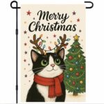 BlissYardのクリスマスガーデンフラッグは、12×18インチサイズで、メリークリスマスの黒と白の猫デザイン。両面印刷で、アウトドアに最適。赤いスカーフ、トナカイライトやツリーが特徴で、ポーチや芝生パティオにぴったりです。