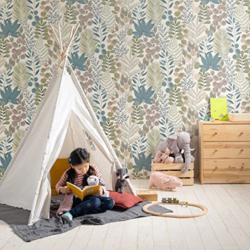 壁紙屋本舗の輸入壁紙は、のり付きで53cm×10mのサイズ。破れにくい厚手のボタニカルデザインで、透けにくく、ミッドサマーをテーマにした北欧スタイルのブルー。天井にも適しており、受注生産品につきキャンセル不可です。