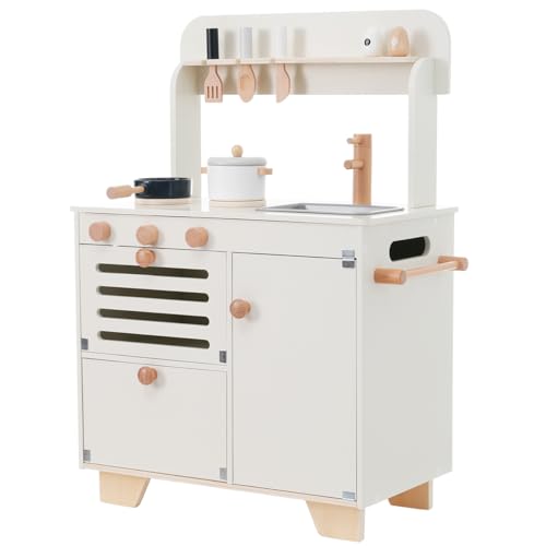 Simpoluの木製おままごとキッチンは、女の子向けの知育玩具です。調理器具、食材、調味料付きで、収納も充実。誕生日やクリスマスのプレゼントに最適なミニキッチン。