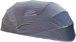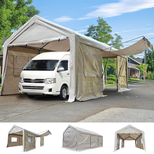 Simpoluの大型車庫テントは、間口3m×高さ2.8m×奥行6mのサイズで、軽自動車用に最適。UVカット、耐水性を備え、頑丈なスチール製の構造が特徴。上開きドア付きで仮設倉庫やカーポートとしても利用できます。色はベージュです。