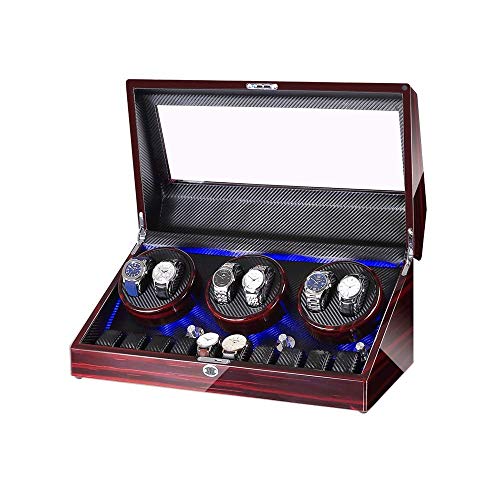 腕時計を6個または10個収納できる時計ワインダー。LEDライトとウッドシェルピアノペイントエクステリアでスタイリッシュ。レザーインテリアとサイレントモーターで高級感と静音性能を実現。