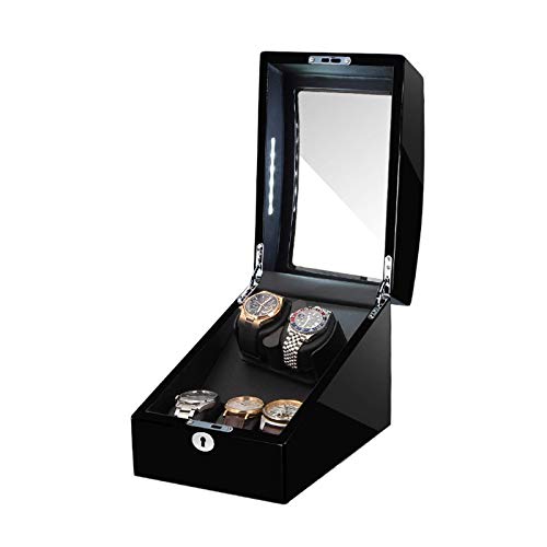 自動時計ワインダーボックスは、2+3のソフトフレキシブル時計枕を内蔵し、LEDライトで照明。ピアノペイントエクステリアでスタイリッシュ。サイレントモーターで静かに時計を巻き上げます。