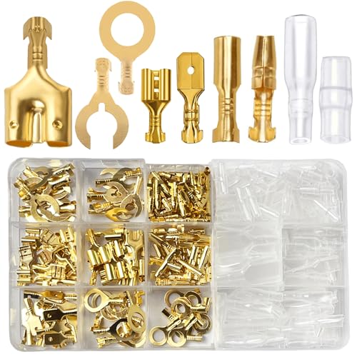 ギボシ端子セットには二股タイプのダブル端子が含まれ、250型の平型、丸型、クワ型が揃っています。圧着端子はΦ6mm、Φ8mmの真鍮製(CA・CW104)で、絶縁スリーブが付いており、バイクや車の配線接続に最適。280個を収録。