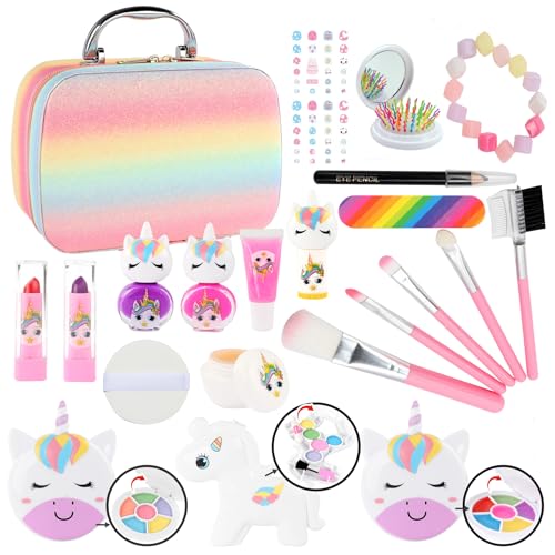 女の子向けメイクセット(22点)です。水で落ちるキッズコスメ、アイシャドウ、口紅、マニキュア、ネイルシールなど。3~10歳向けの誕生日やクリスマスプレゼントに最適。収納ボックス付き。