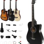 アコースティックギター初心者入門セット。17点が揃い、練習用に最適。ソフトケース付きで持ち運びも便利。シンプルなブラックデザインが魅力のギターです。