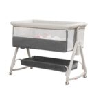 新生児から3歳まで使える折りたたみベビーベッド。高さ6段調節可能でポータブル。おむつ交換台、収納バスケット、蚊帳付き。デザインはピンク、素材は炭素鋼。