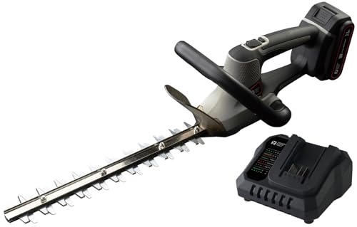 山善(YAMAZEN)の18Vヘッジトリマーは、充電式で刈込幅約300mm、両刃タイプ。セットには本体、充電器、2.5Ahバッテリーが含まれ、軽量でコンパクト。庭木や生垣の剪定に最適です。